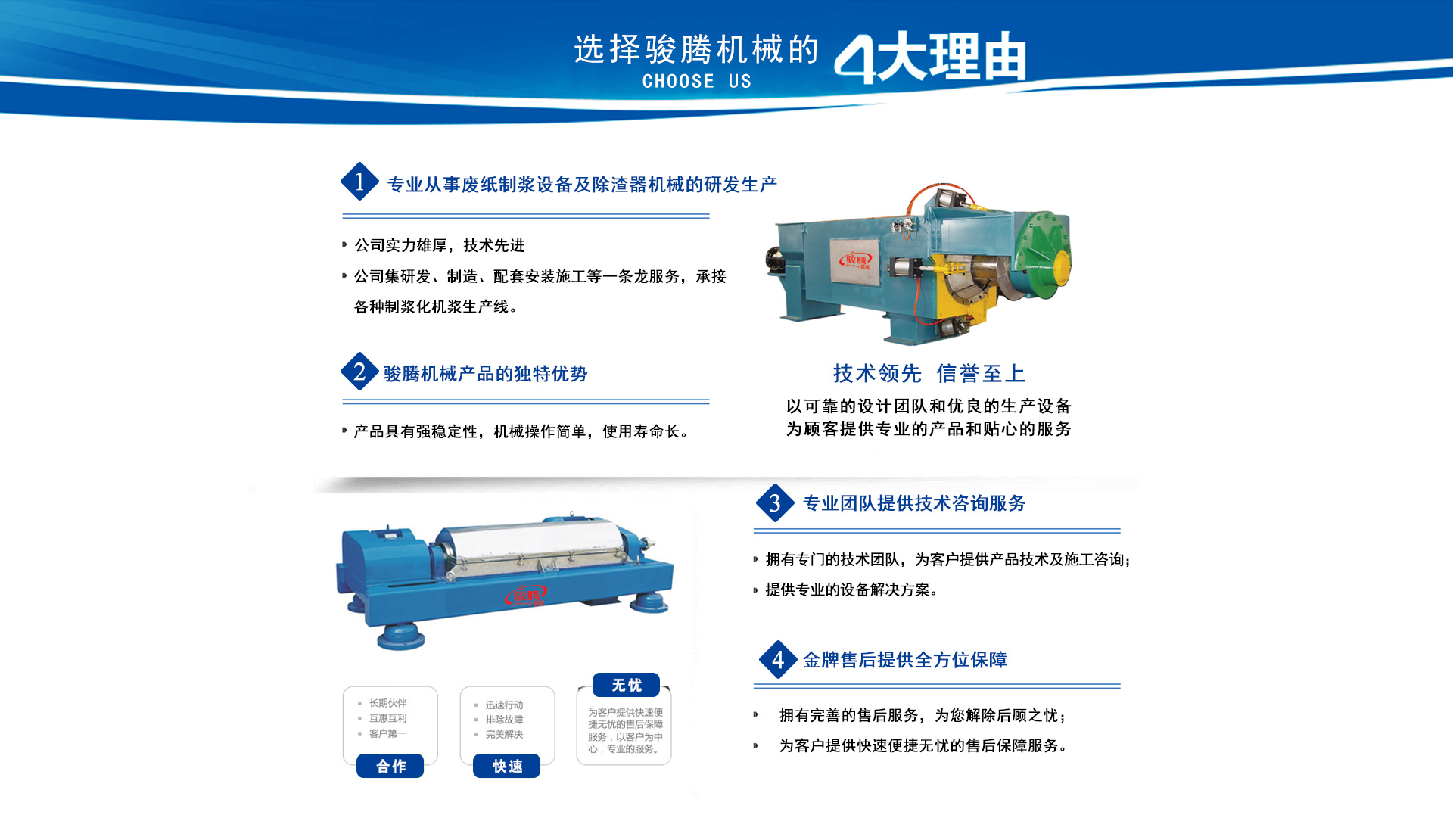安丘市駿騰機(jī)械制造有限公司位于中國風(fēng)箏之都濰坊南35公里,座落在青云湖畔,是具有活力的安丘市興安街道工業(yè)園。 依托風(fēng)箏之都完善的工業(yè)基礎(chǔ)和發(fā)達(dá)的機(jī)械制造業(yè),公司致力于廢紙制漿設(shè)備及除渣器機(jī)械的研究與制造。 公司始終堅持以市場需求為先導(dǎo),客戶利益為目標(biāo),嚴(yán)格執(zhí)行國家技術(shù)及行業(yè)標(biāo)準(zhǔn),保證產(chǎn)品品質(zhì),提供專業(yè)服務(wù),用專業(yè)的產(chǎn)品與真誠的客戶實現(xiàn)共同發(fā)展,是我們終生奮斗的目標(biāo)。讓我們攜手共進(jìn),創(chuàng)造美好明天。 我們熱情期待著您的光臨指導(dǎo),洽談業(yè)務(wù)! 查看更多>>